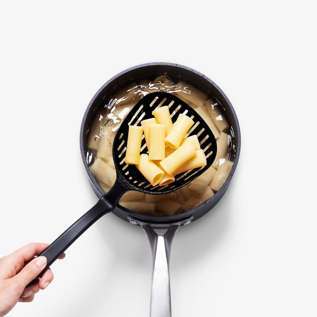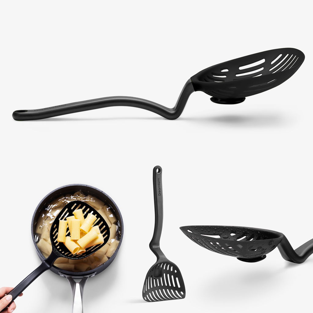 Dreamfarm Lestrain hålslev 28,8 cm med vinklat skaft kombinerar smart design med praktisk funktion. Det stora, flexibla slehuvudet gör det enkelt att komma åt även längst ner i grytor och kastruller. De fina hålen dränerar snabbt vätska, vilket passar perfekt för allt från kokta grönsaker och pasta till dumplings.